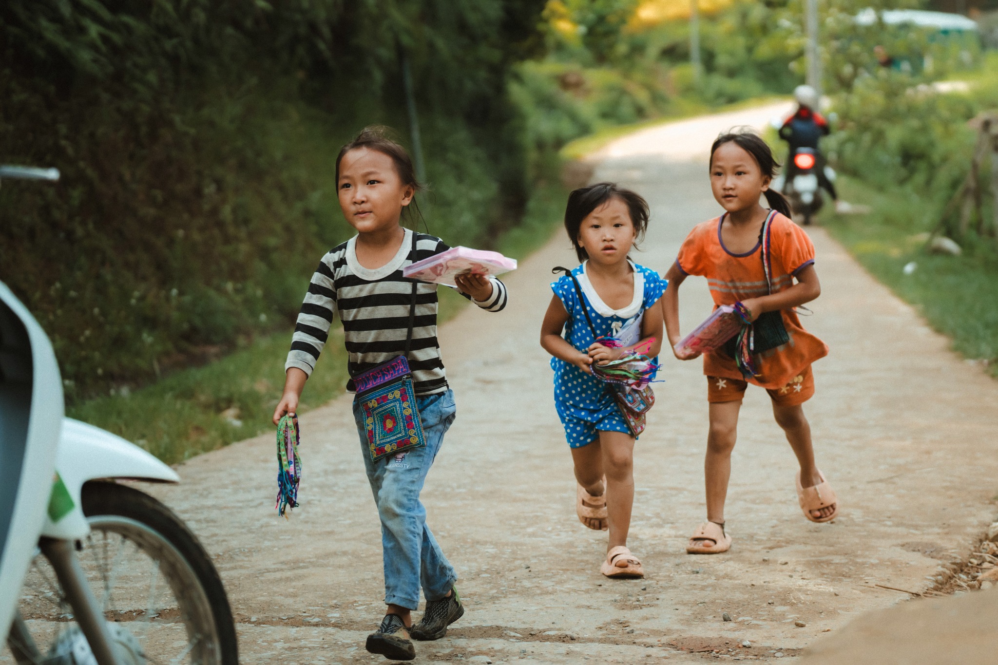 Ghé xóm nhỏ, bạn sẽ dễ dàng bắt gặp những đứa trẻ người H’mông đang nô đùa hay những em bé xúng xính trong chiếc váy thổ cẩm đầy màu sắc, bập bẹ tiếng Kinh “cin chao” khi được du khách nhiệt tình hỏi han.
